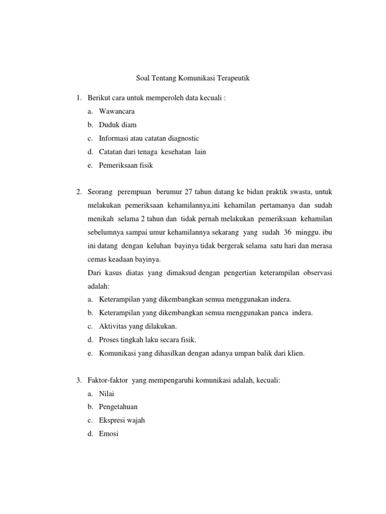 Soal Komunikasi Terapeutik Pdf from imgv2-1-f.scribdassets.com Contoh soal eksponen kumpulan soal pelajaran 5. Ikatan kovalen koordinasi terdapat pada …. Kali ini kita akan membahas soal simulasi digital untuk kelas 10 beserta kunci jawabannya. Www.hadisetyo.com try out un fisika sma 2016 berilah tanda silang (x) pa. Contoh soal pilgan anatomi fisiologi kelas x smk keperawatan. Contoh soal komunikasi keperawatan (komkep) dasar beserta kunci jawaban. Penjumlahan dengan rumus kosinus resultan beberapa vektor dengan metode penguraian atau analitis. Berikut ini cecepgaos.com bagikan contoh soal akm level 5 kelas 9 dan 10 dari pusat asesmen dan pembelajaran badan penelitian dan pengembangan perbukuan kementerian.
